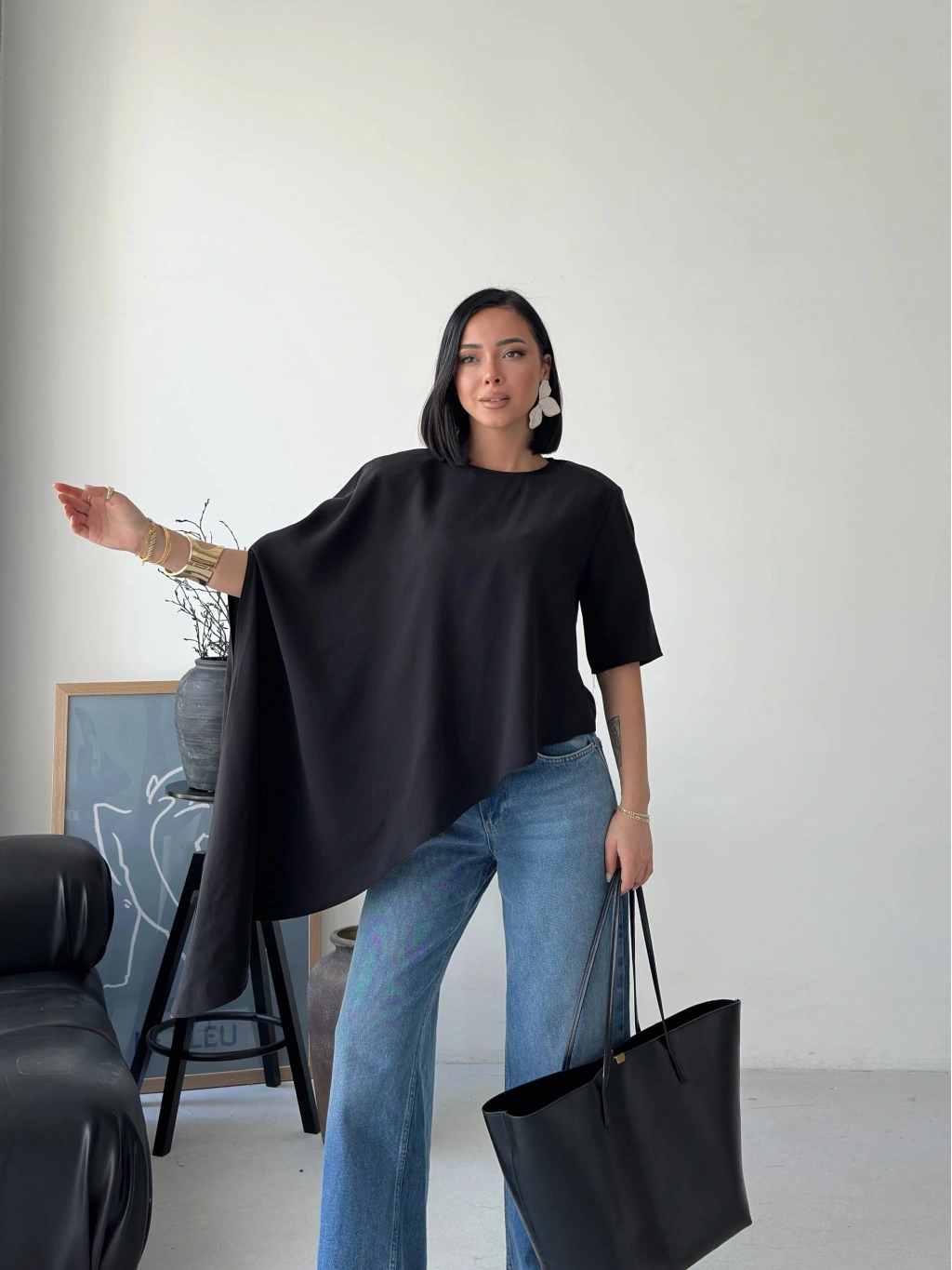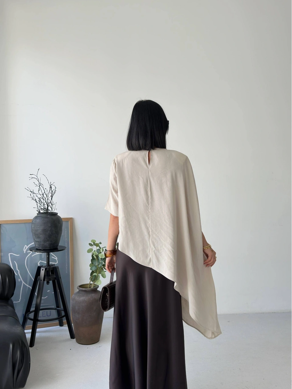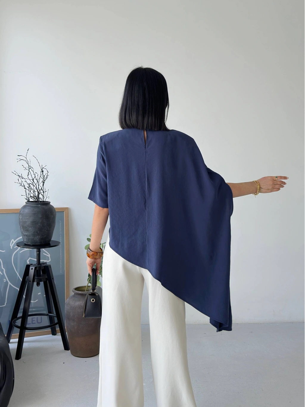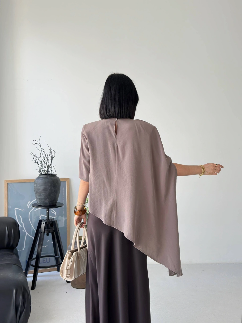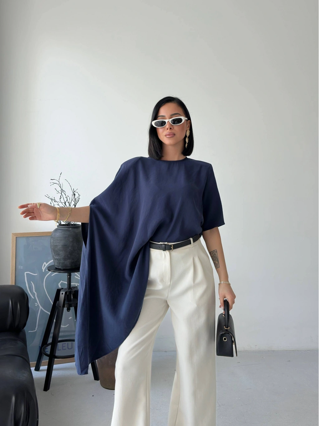 Minimal tasarımın güçlü bir yorumu olan bu asimetrik dökümlü salaş bluz, modern stil anlayışını ön plana çıkarır. Yumuşak dokusu ve akıcı kesimiyle gün boyu rahatlık sunarken, asimetrik formu sayesinde kombinlerine sofistike bir hava katar. İster günlük kombinlerinde ister daha özenli stil seçimlerinde rahatlıkla kullanabileceğin bu parça, sade şıklığın en etkileyici halini yansıtır.