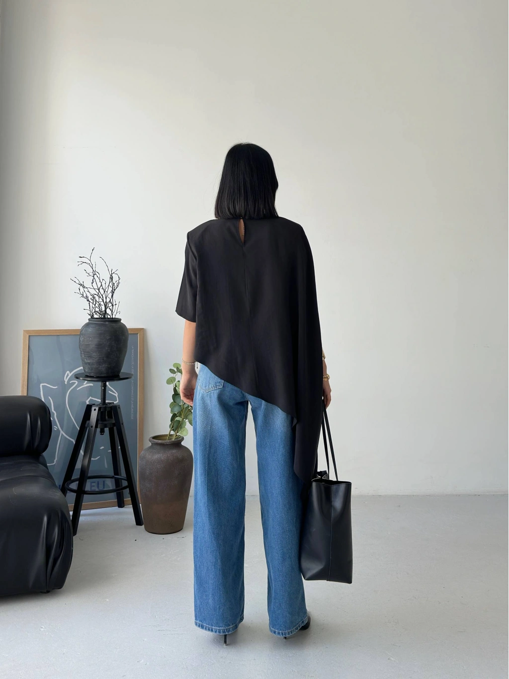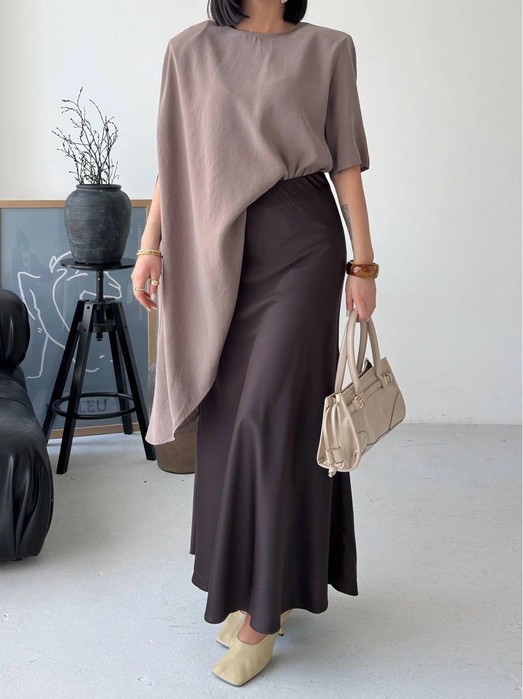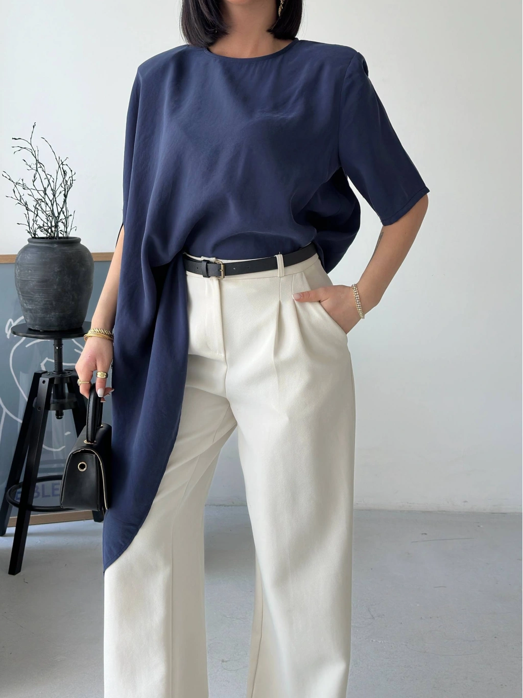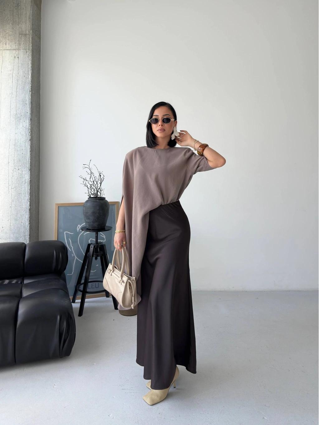 Minimal tasarımın güçlü bir yorumu olan bu asimetrik dökümlü salaş bluz, modern stil anlayışını ön plana çıkarır. Yumuşak dokusu ve akıcı kesimiyle gün boyu rahatlık sunarken, asimetrik formu sayesinde kombinlerine sofistike bir hava katar. İster günlük kombinlerinde ister daha özenli stil seçimlerinde rahatlıkla kullanabileceğin bu parça, sade şıklığın en etkileyici halini yansıtır.