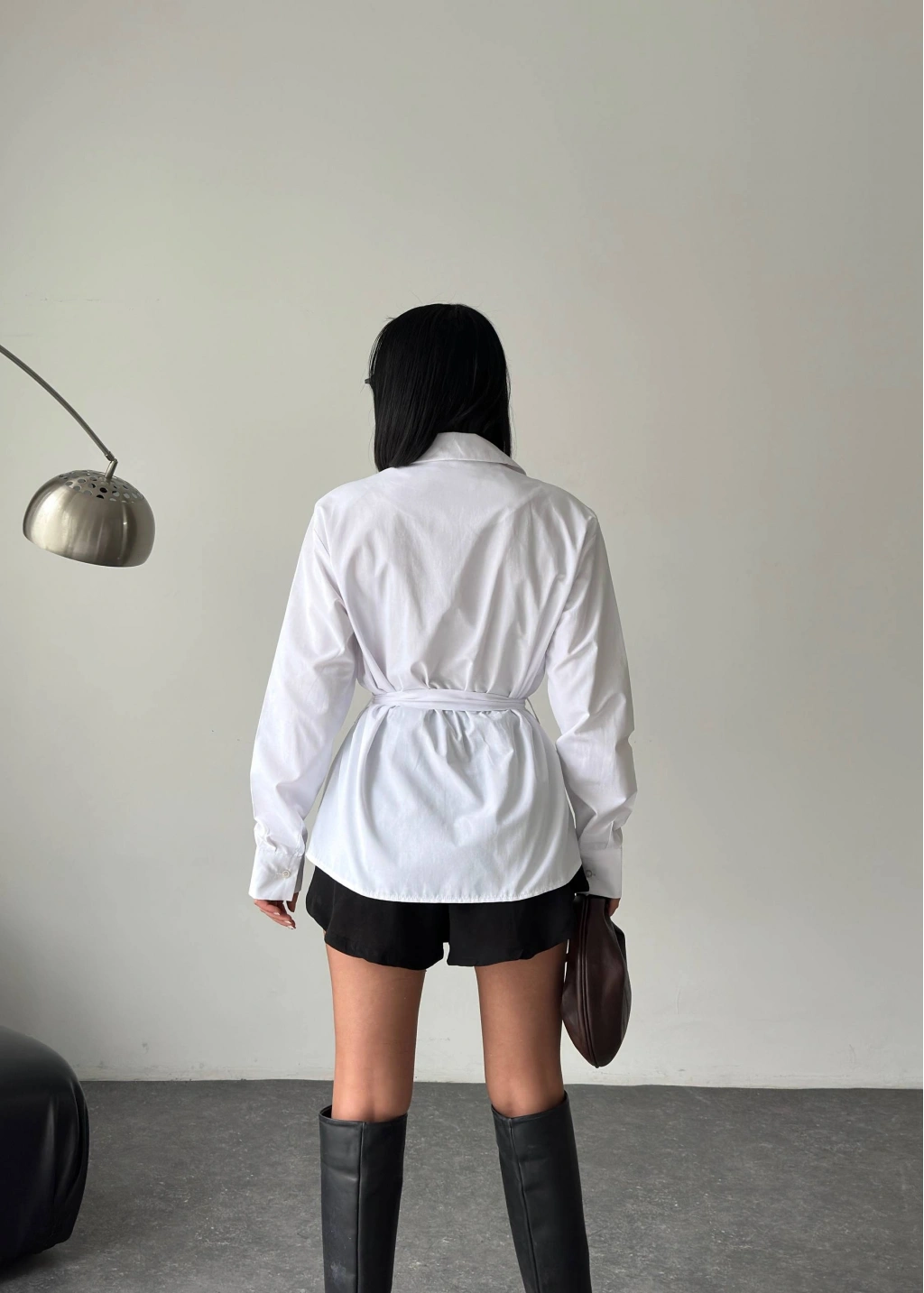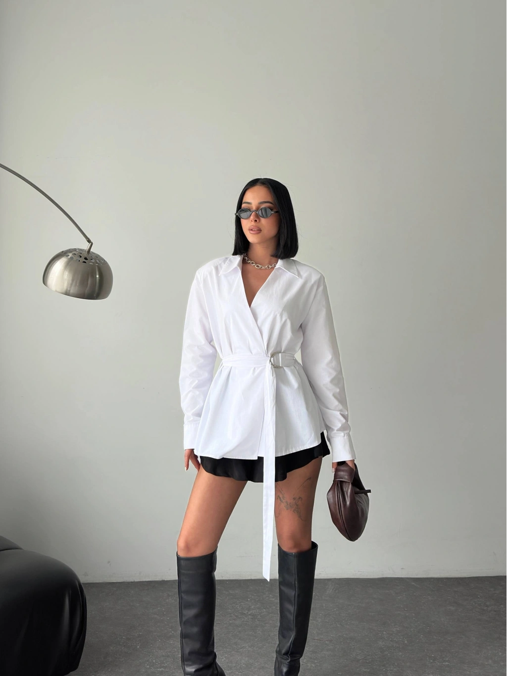 Güçlü ve feminen bir siluet sunan kemer detaylı kruvaze poplin gömlek, klasik gömlek formuna modern bir yorum katıyor.