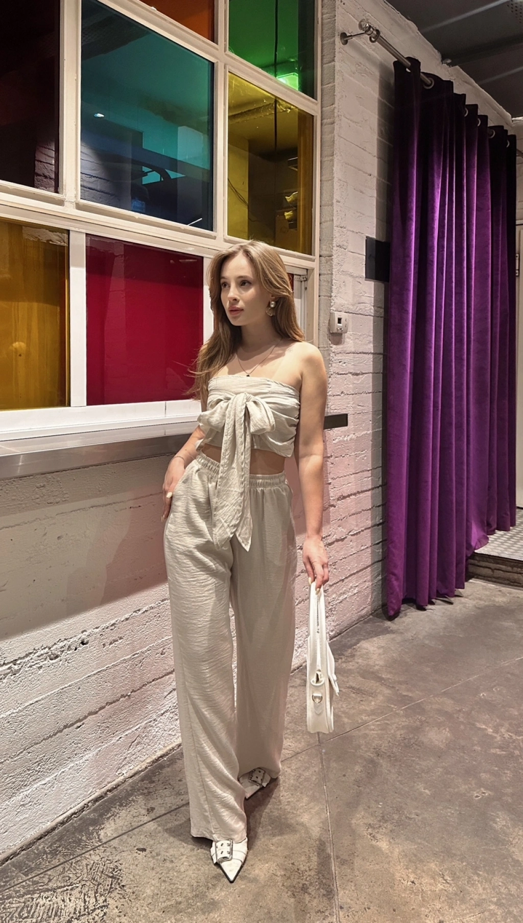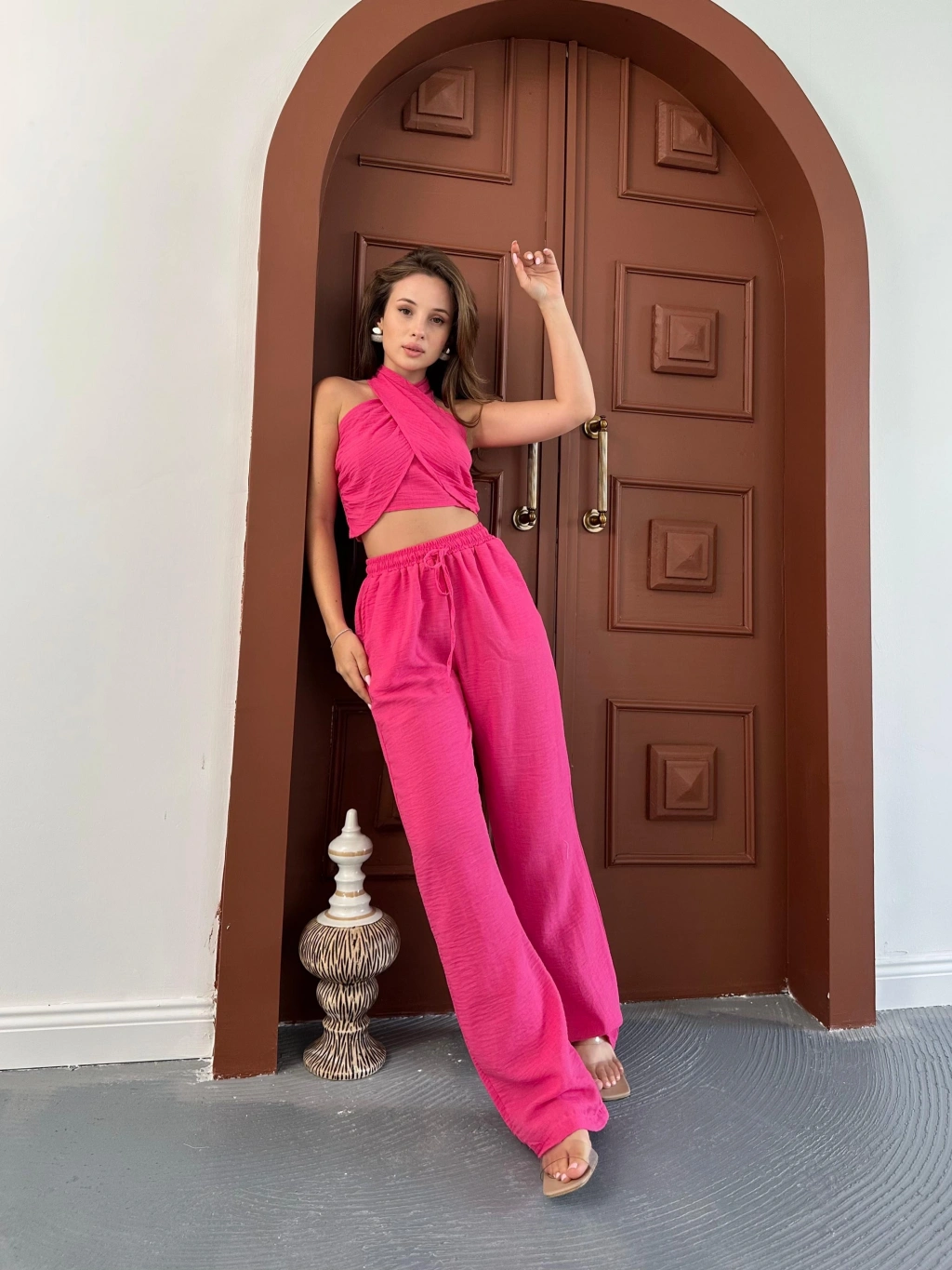 Boyundan bağlama detay bluz ve pantolonlu keten ikili takım