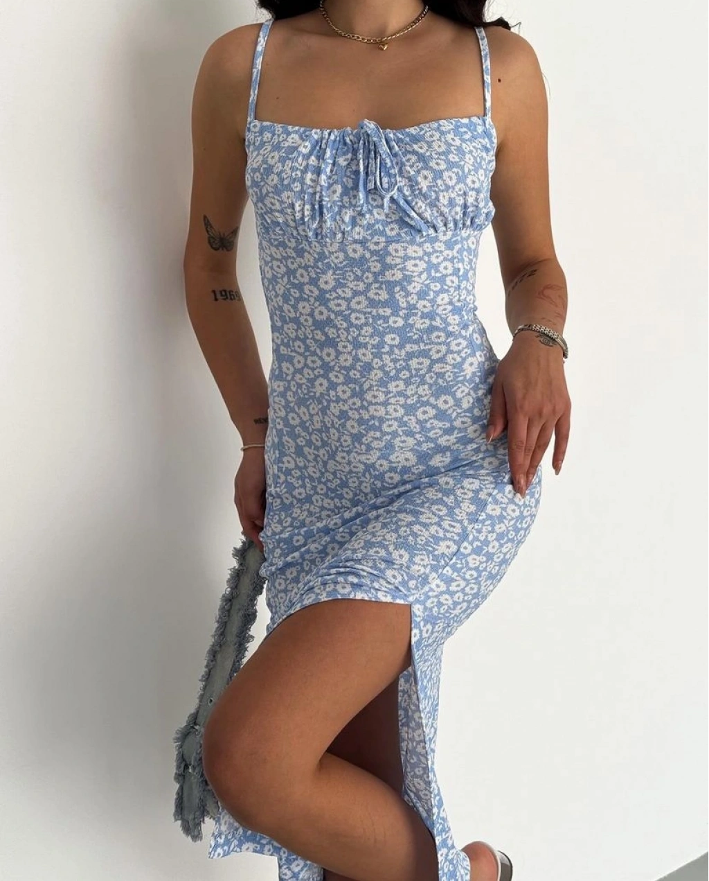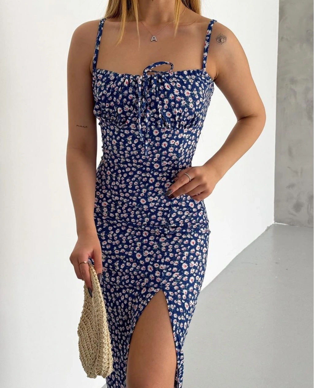 Bürümcük kumaş çıtır çiçekli askılı elbise
