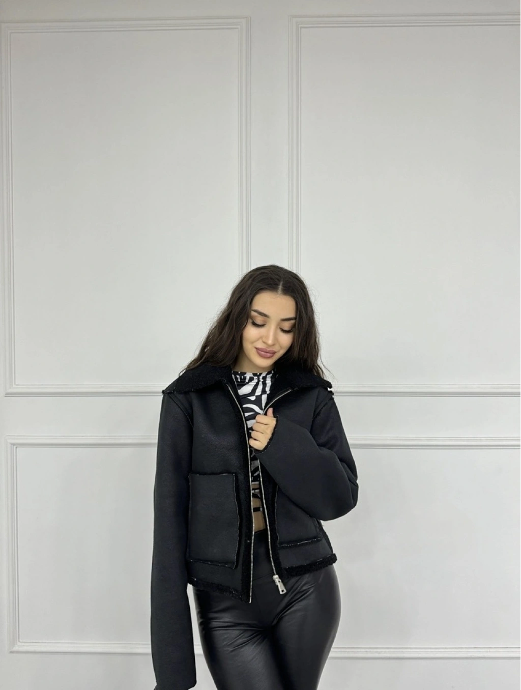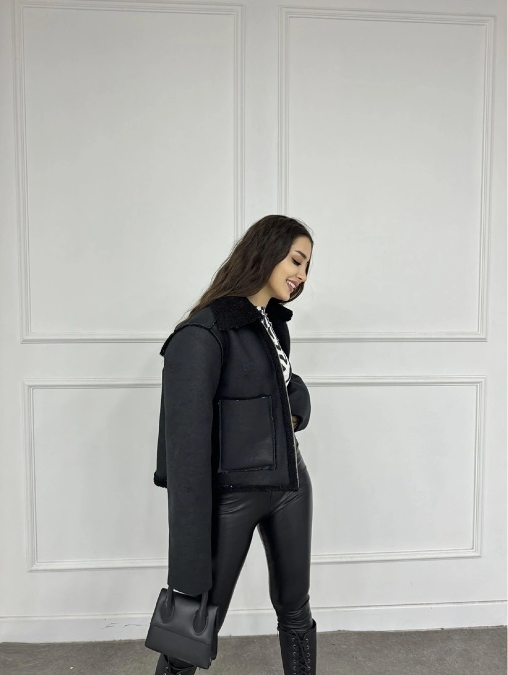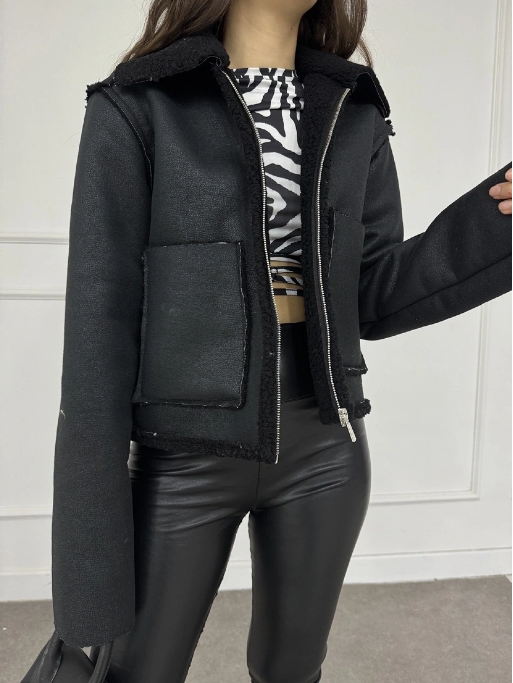 Cep detay lamine içi kürklü ceket