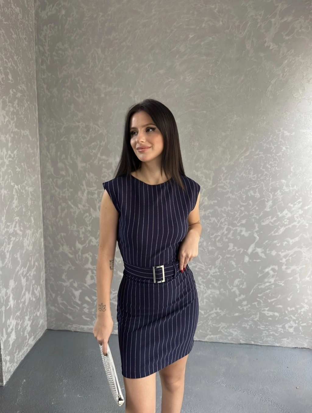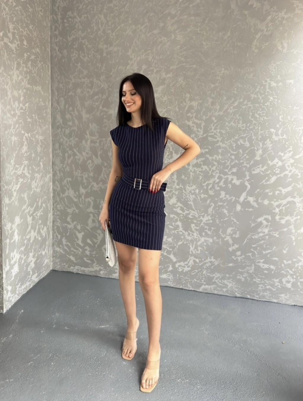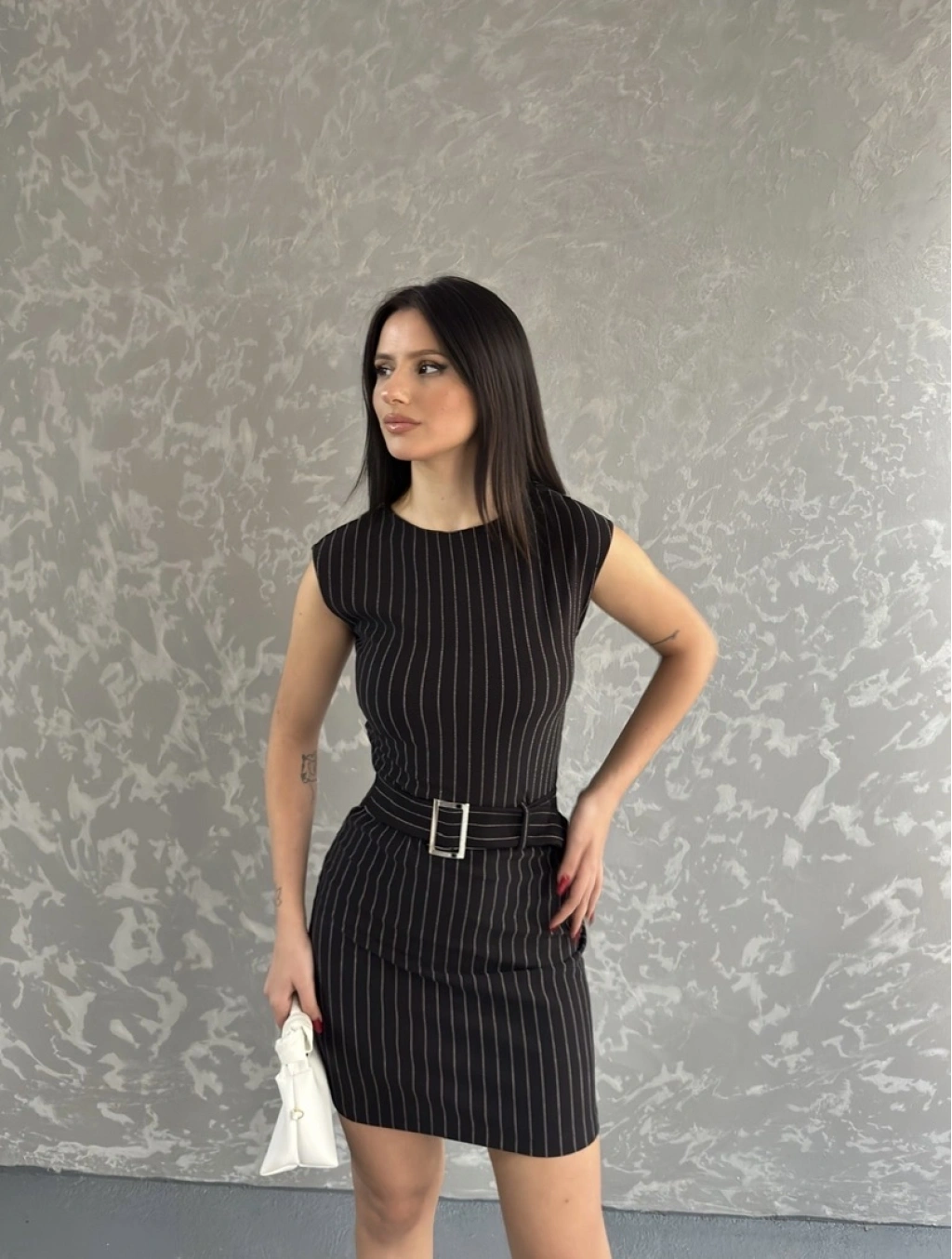 Çizgili Kemer detay mini elbise