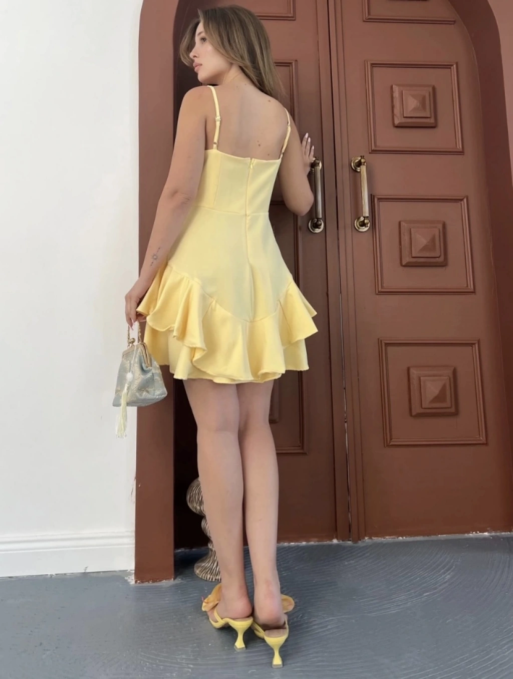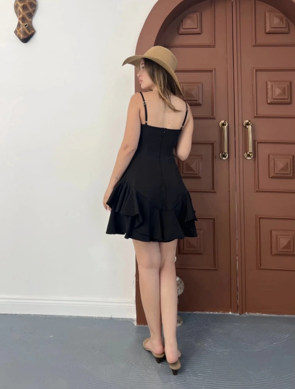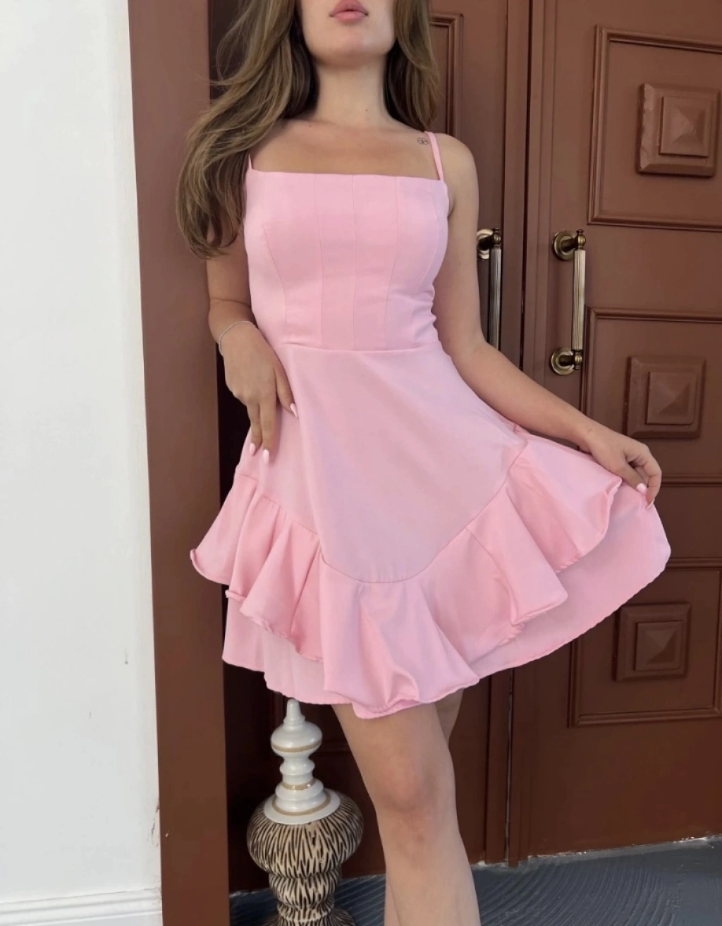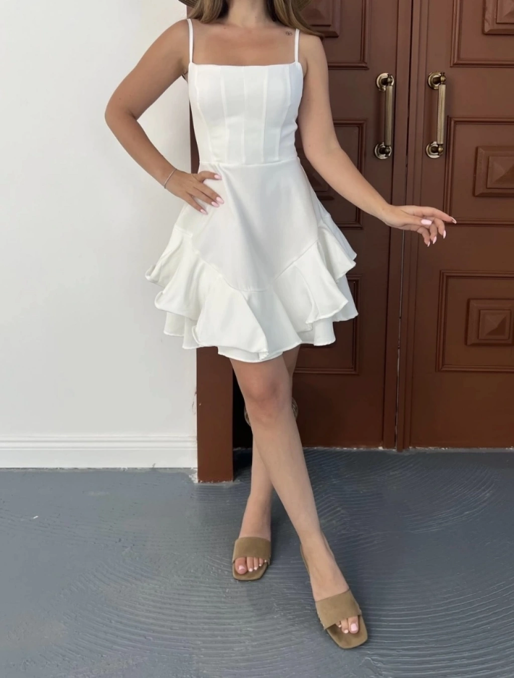 Fırfır detay askılı mini elbise