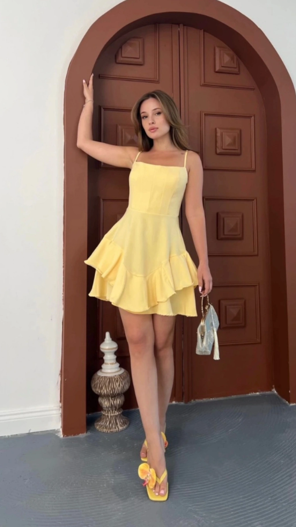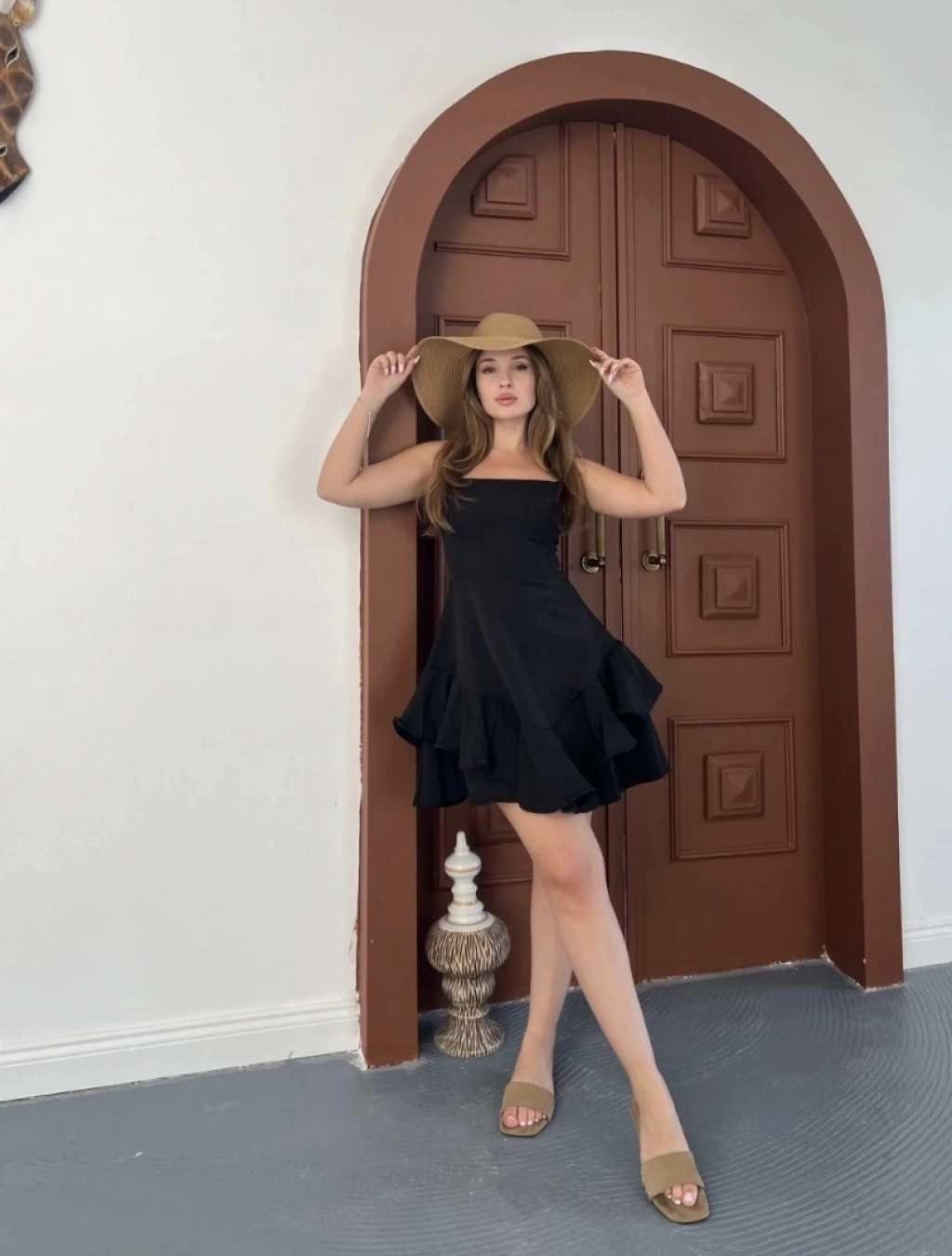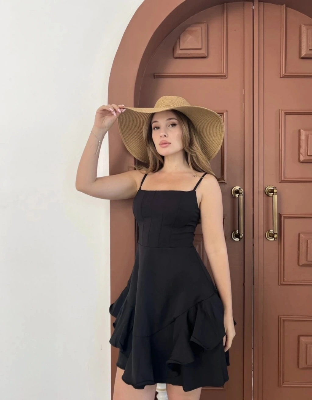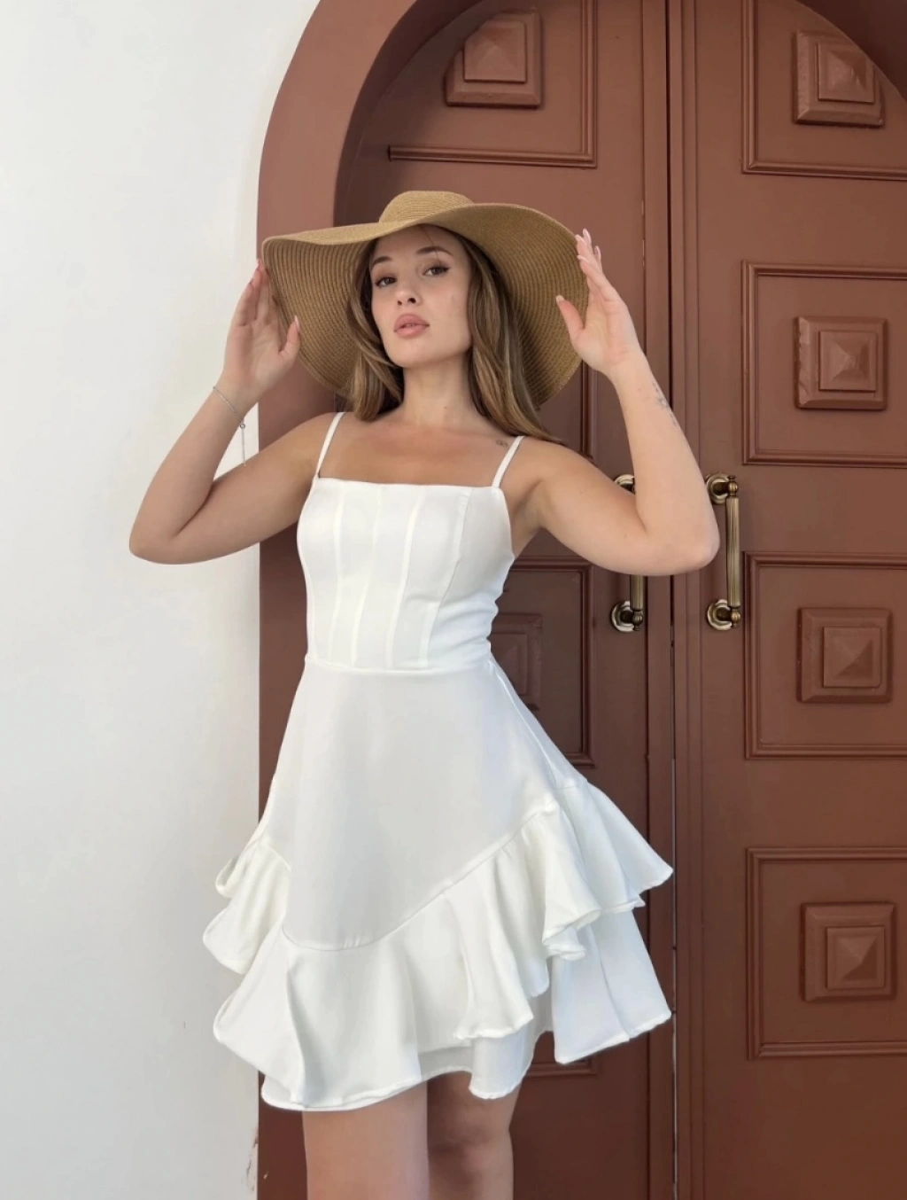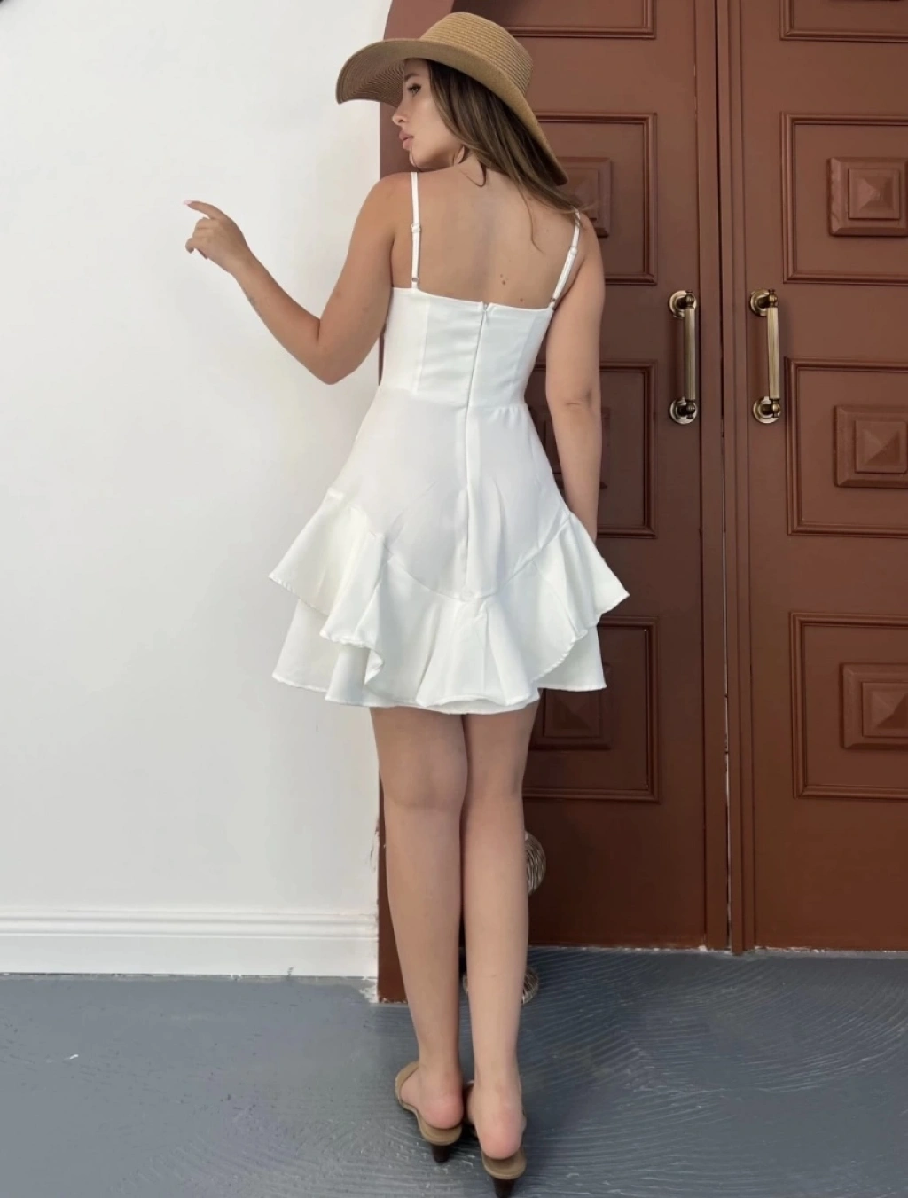 Fırfır detay askılı mini elbise