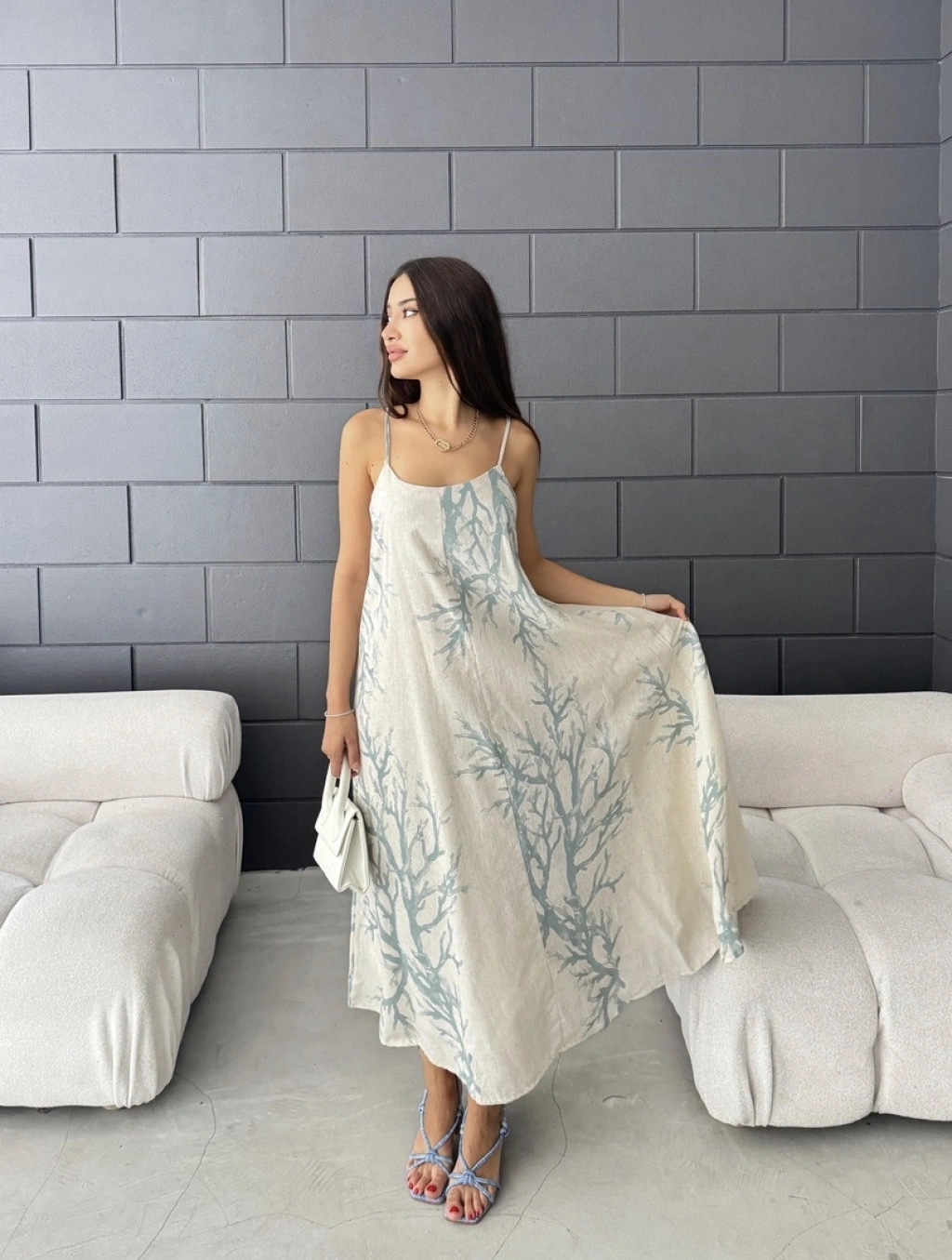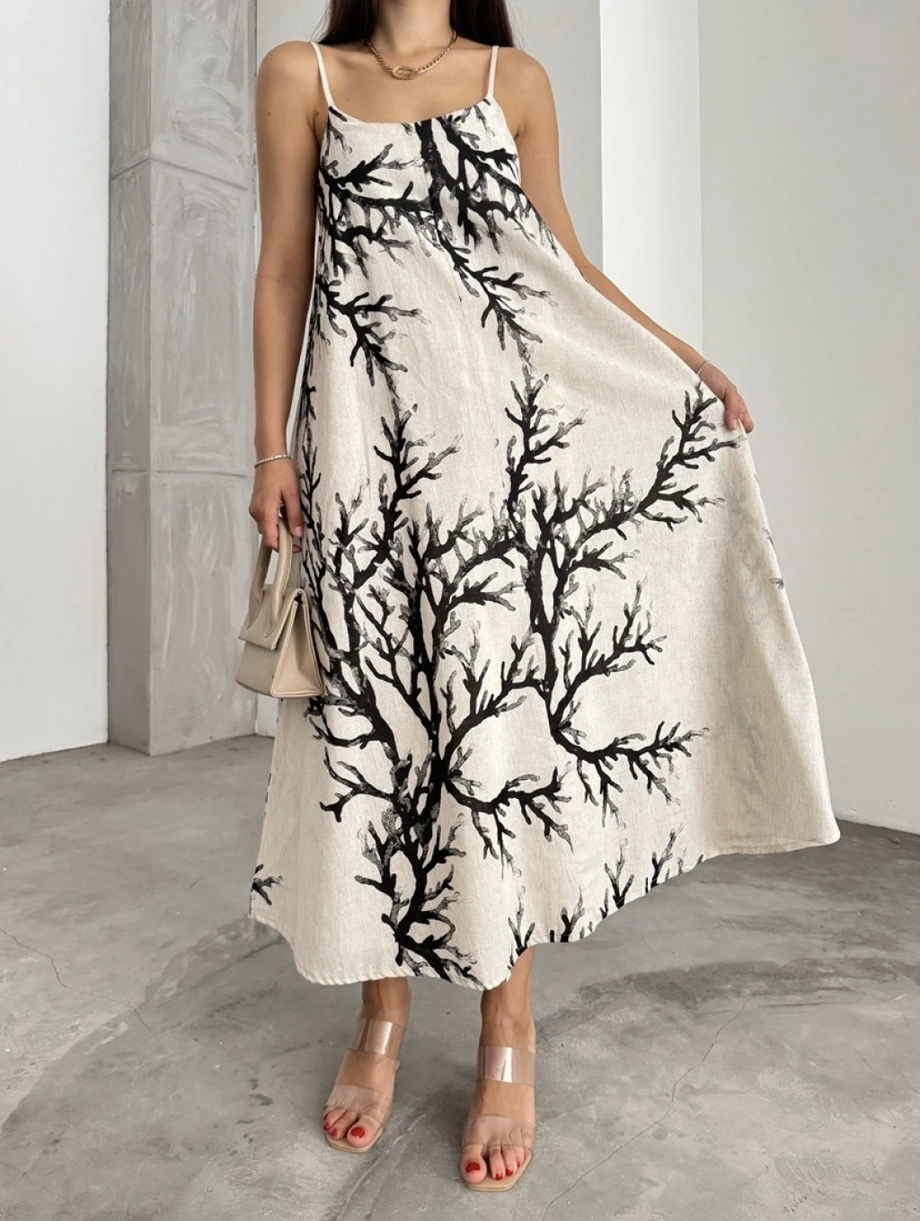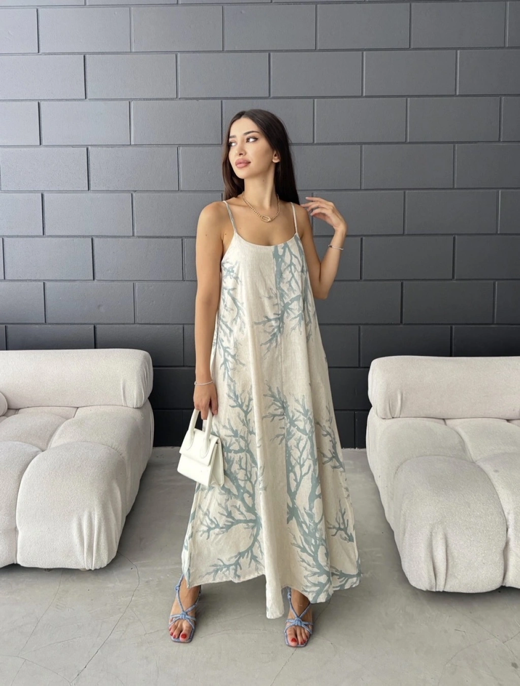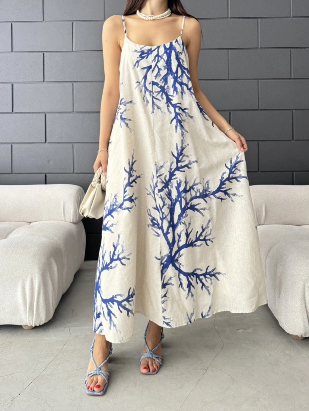 Keten desenli askılı uzun elbise