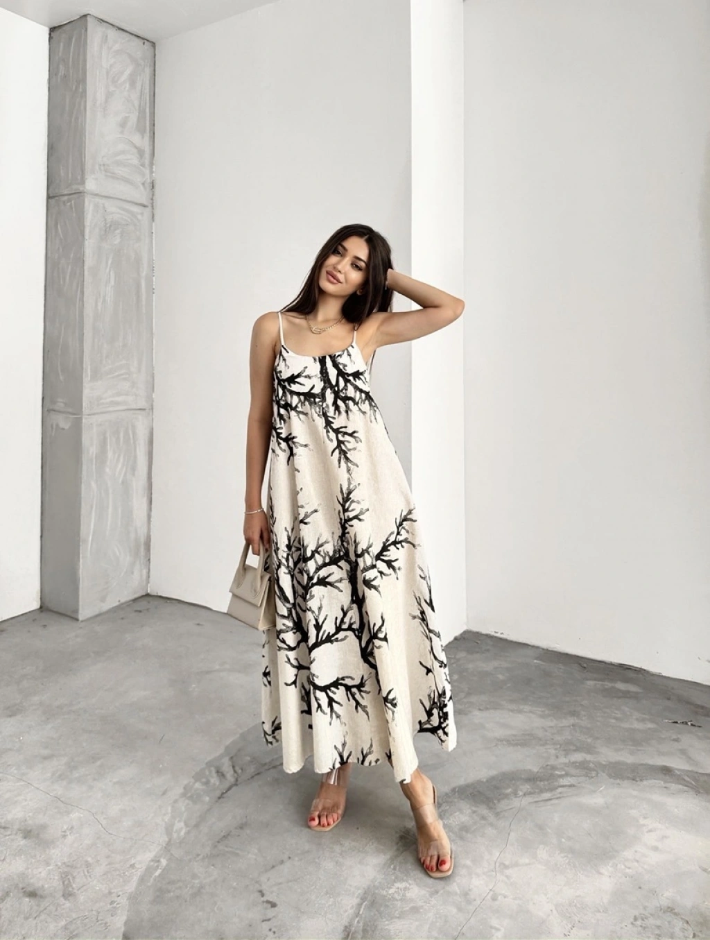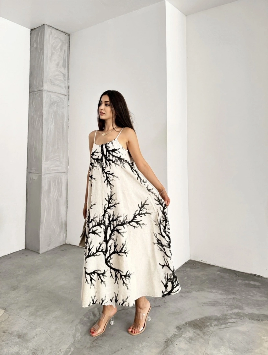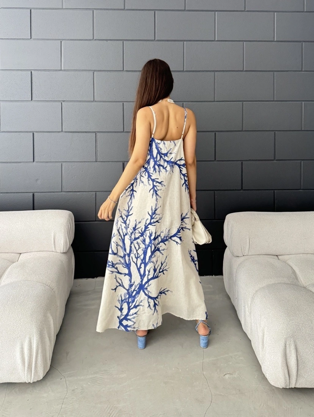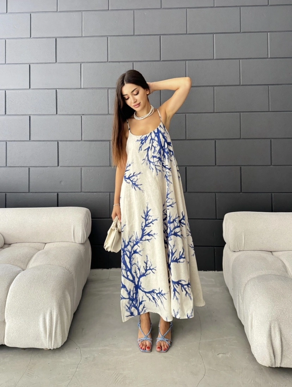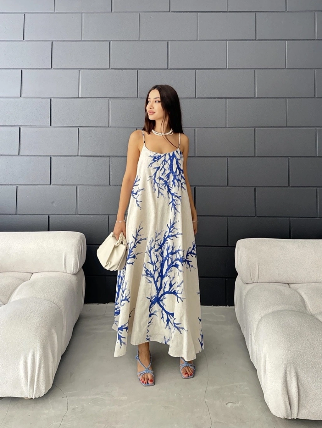 Keten desenli askılı uzun elbise