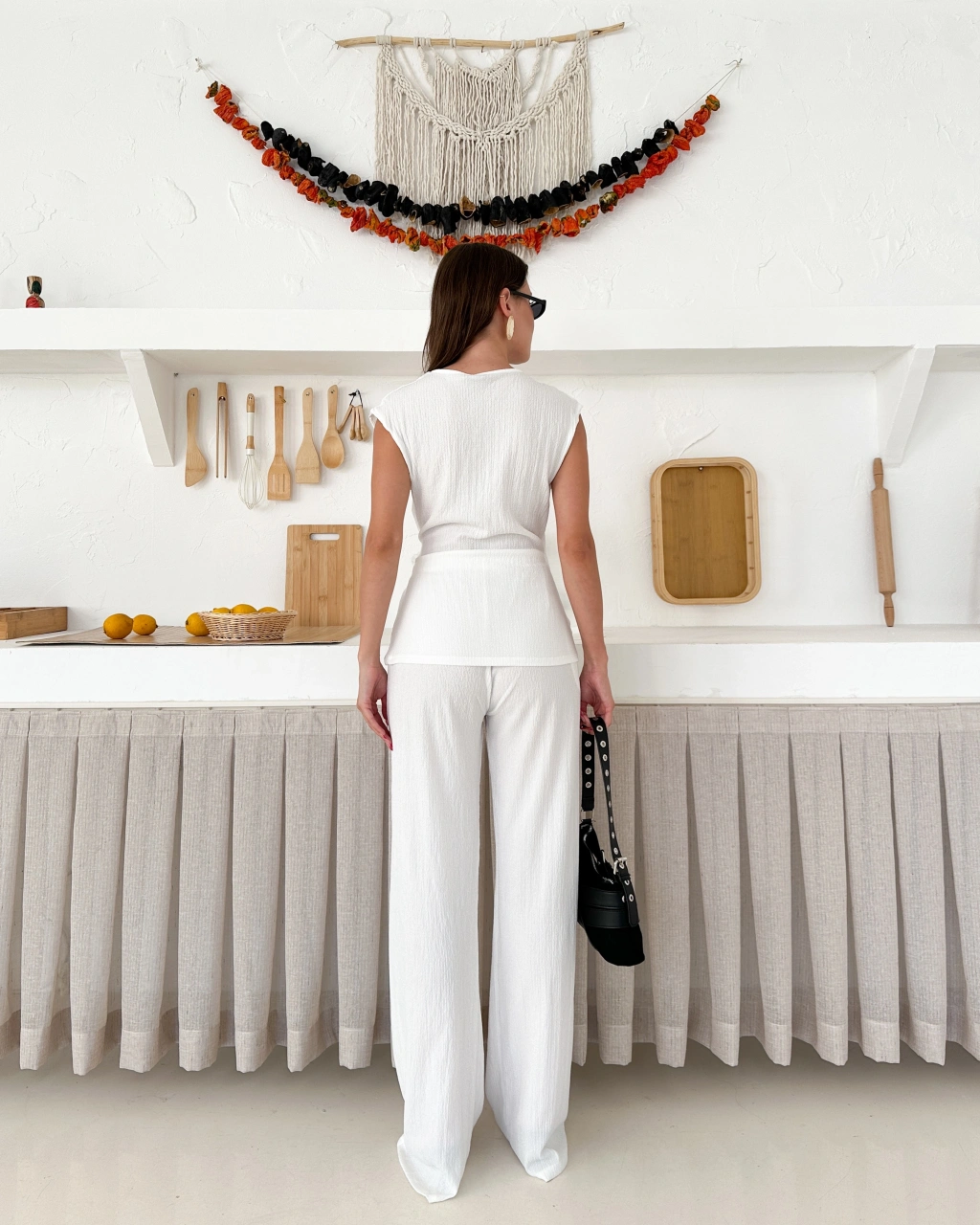 Boyundan bağlama detay bluz ve pantolonlu keten ikili takım