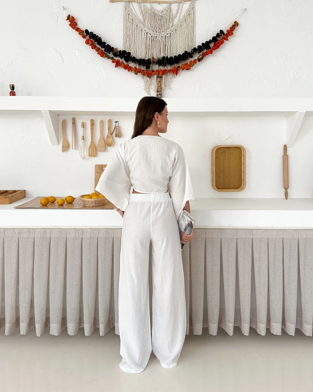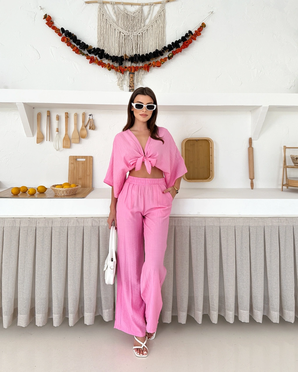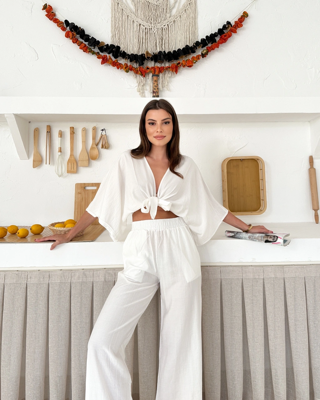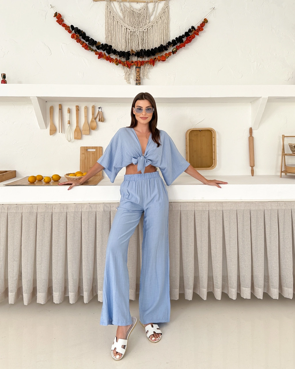 Boyundan bağlama detay bluz ve pantolonlu keten ikili takım
