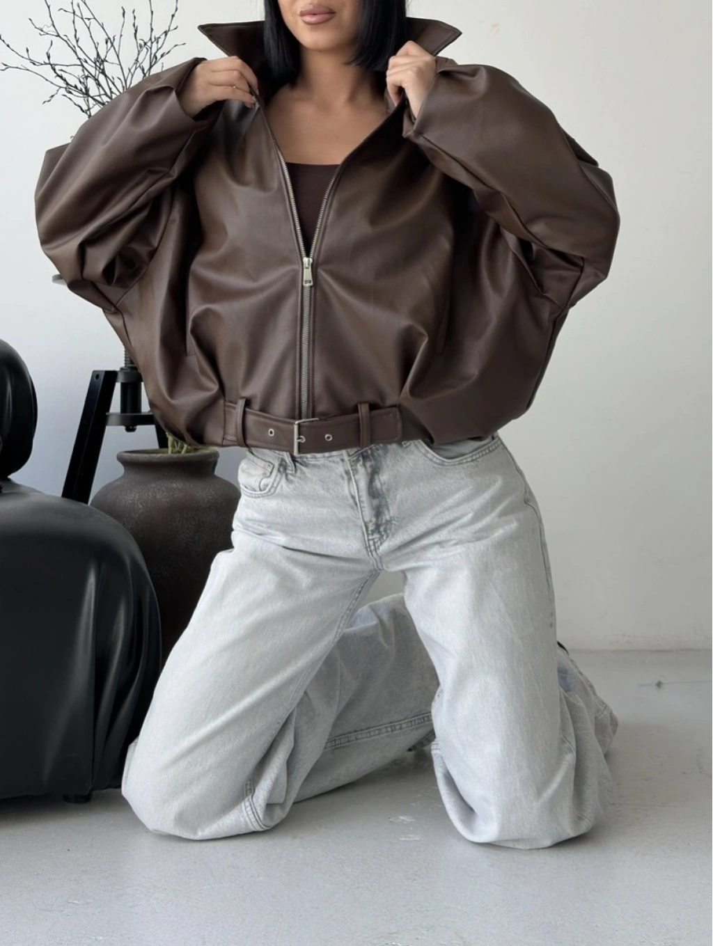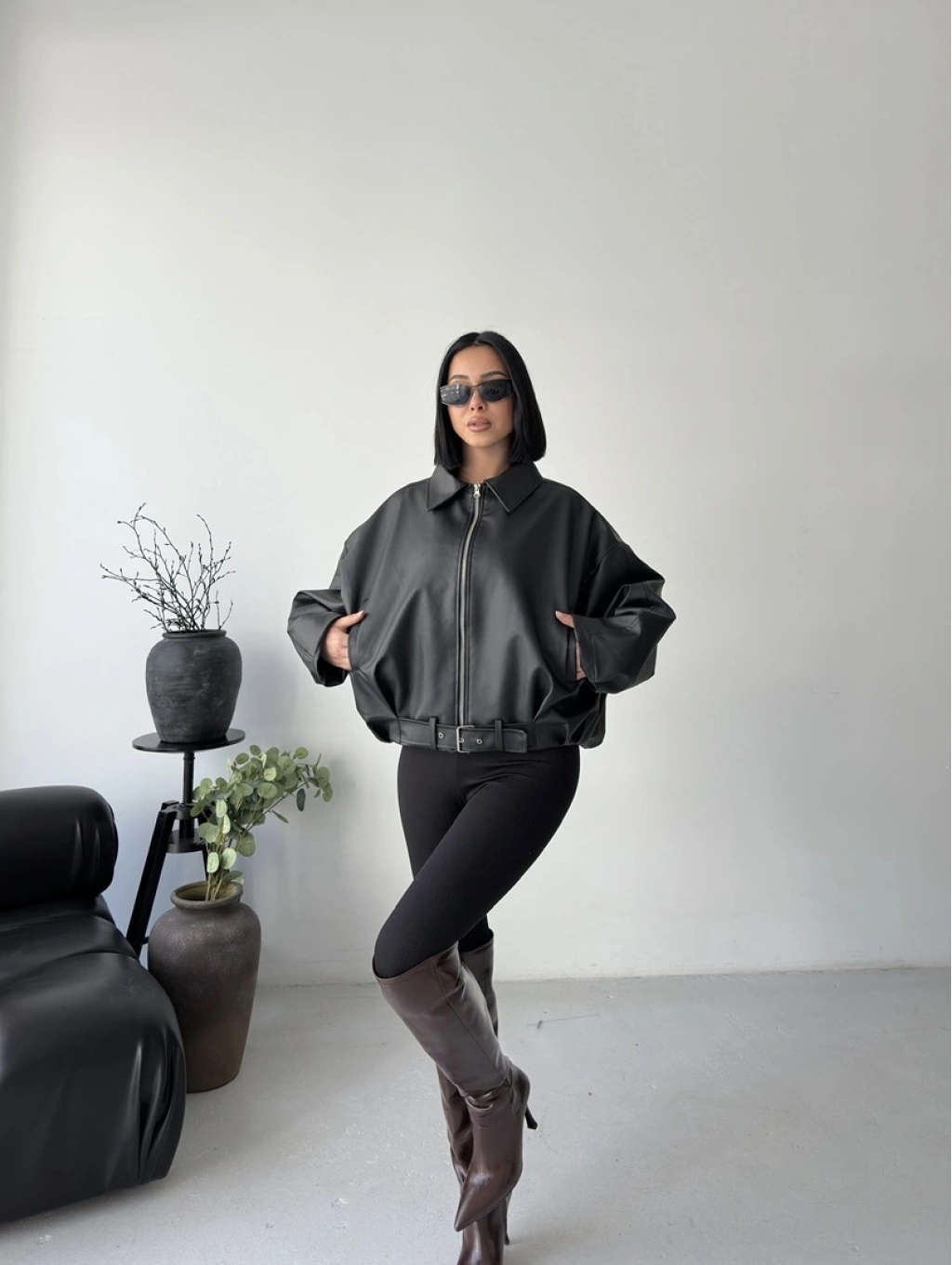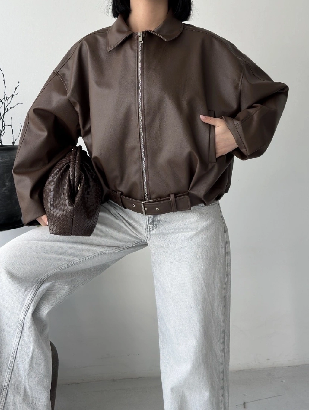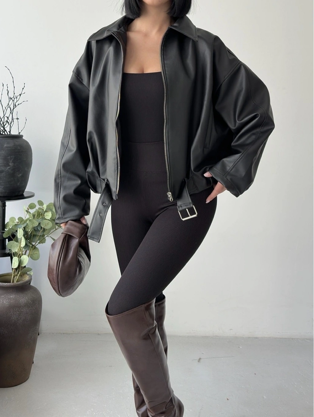 Oversize fermuarlı kemer detay deri ceket