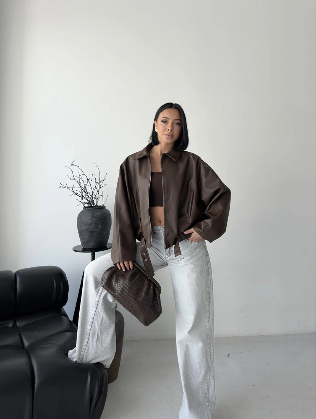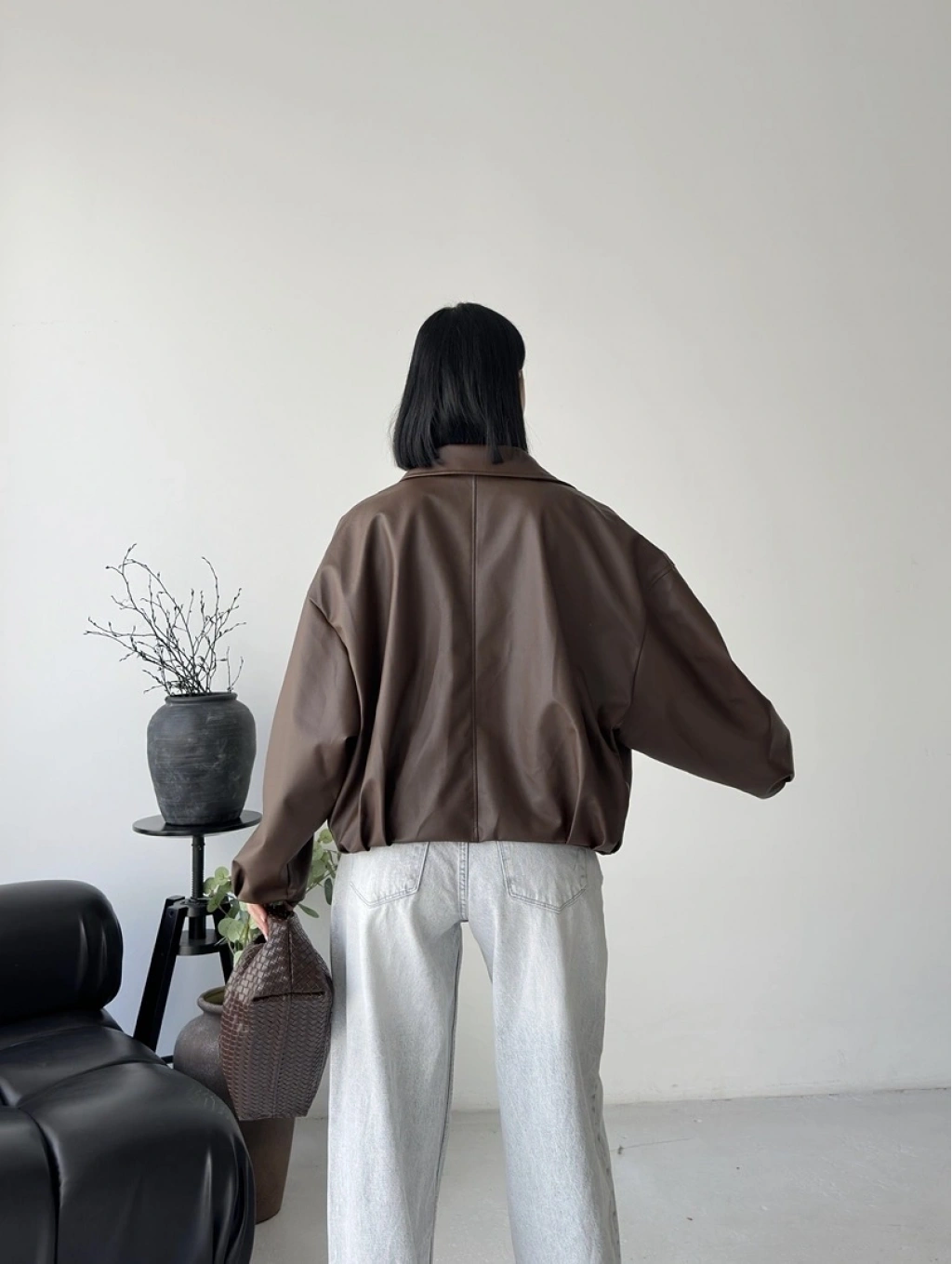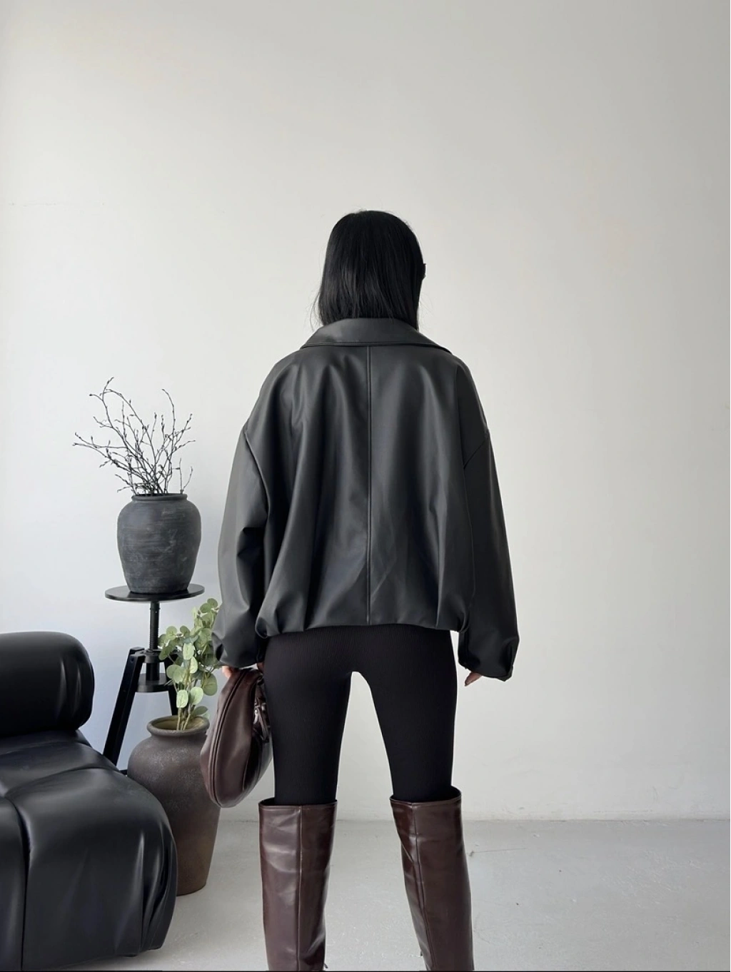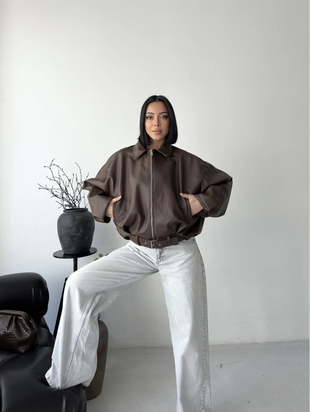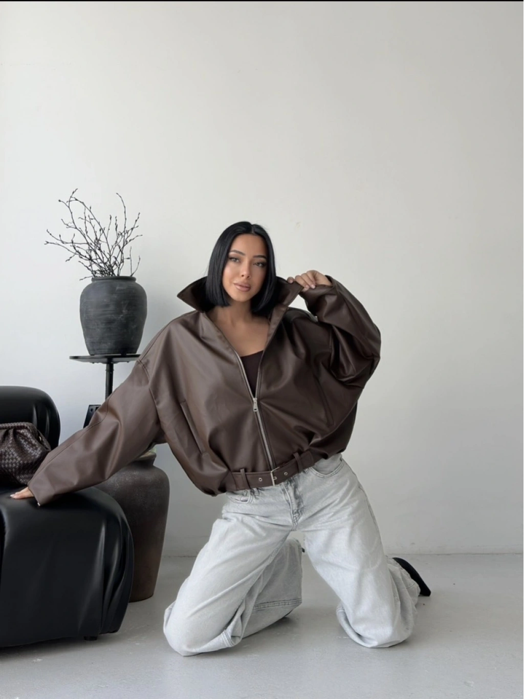 Oversize fermuarlı kemer detay deri ceket