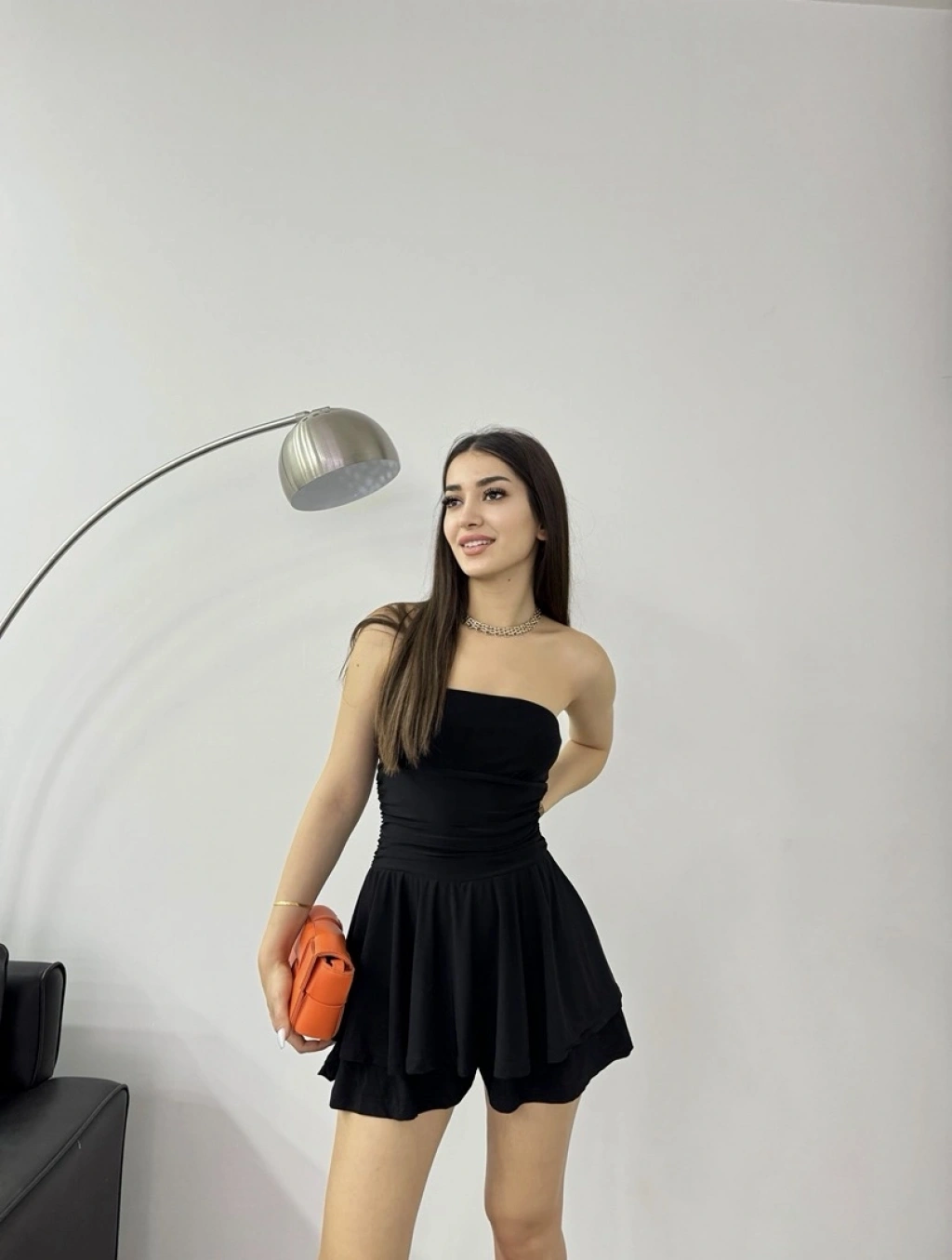 Sırt dekolteli aksesuar detay mini elbise