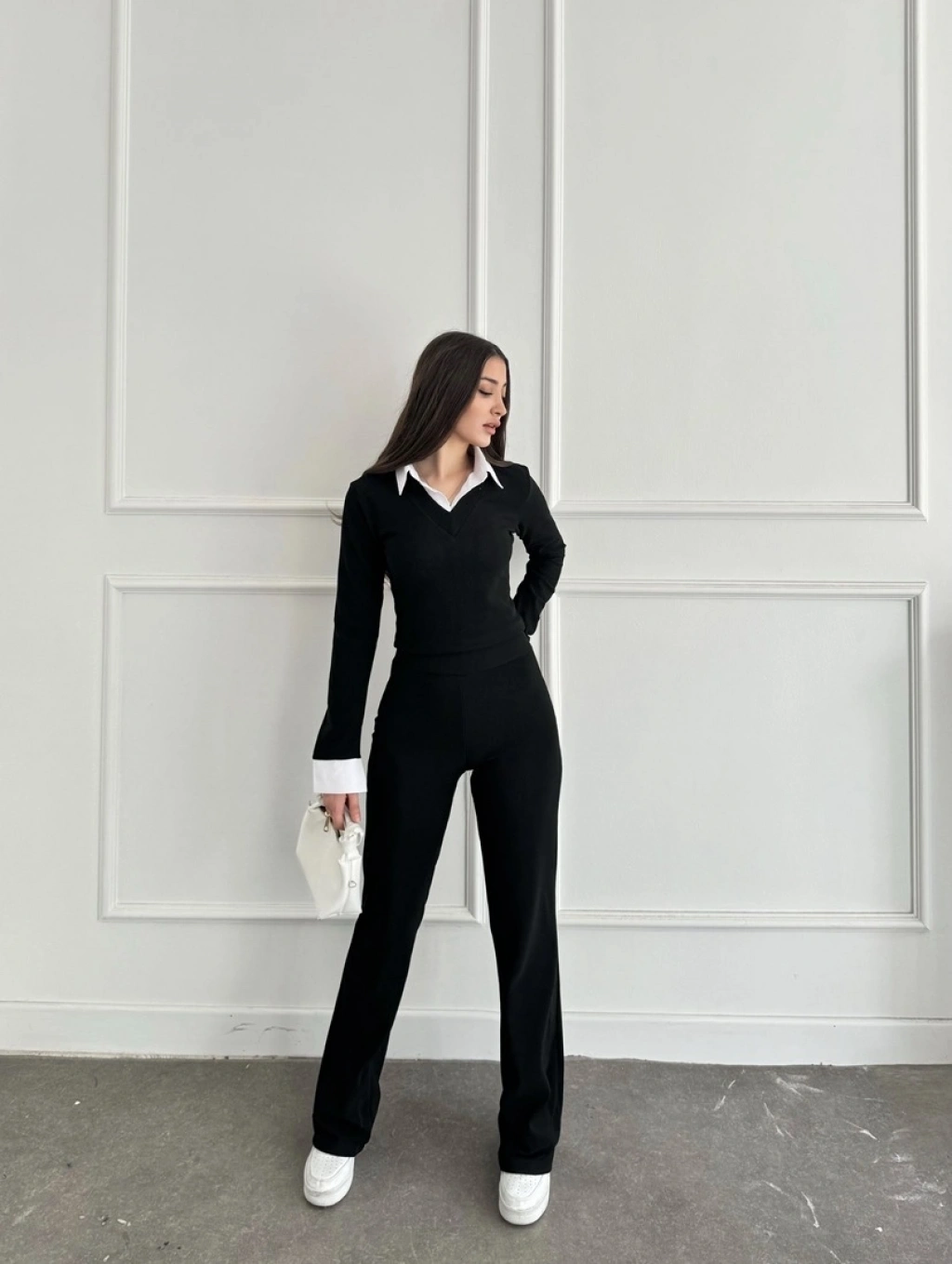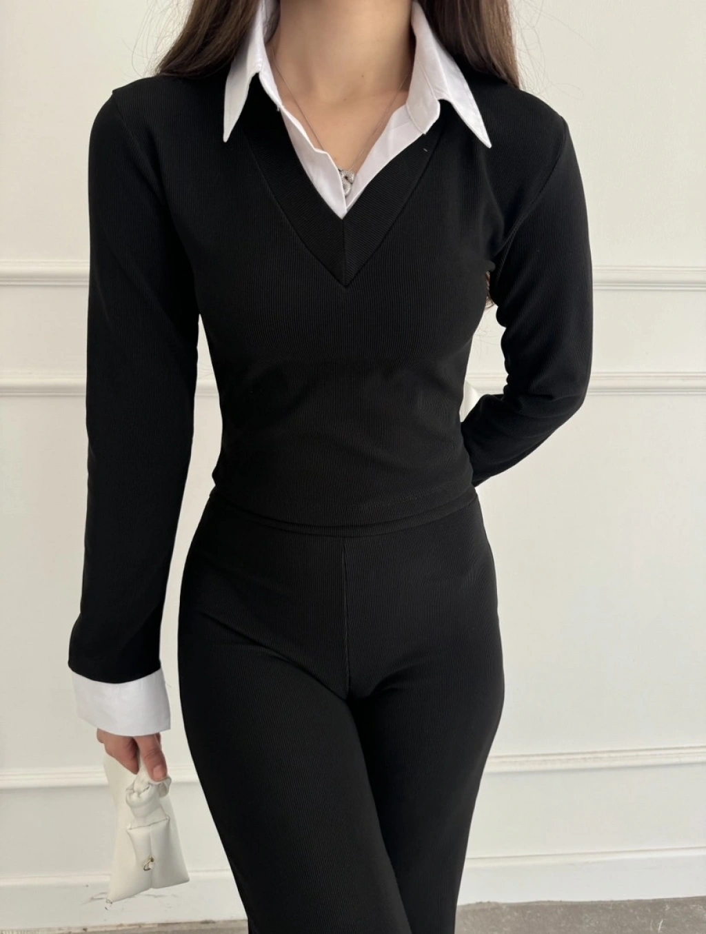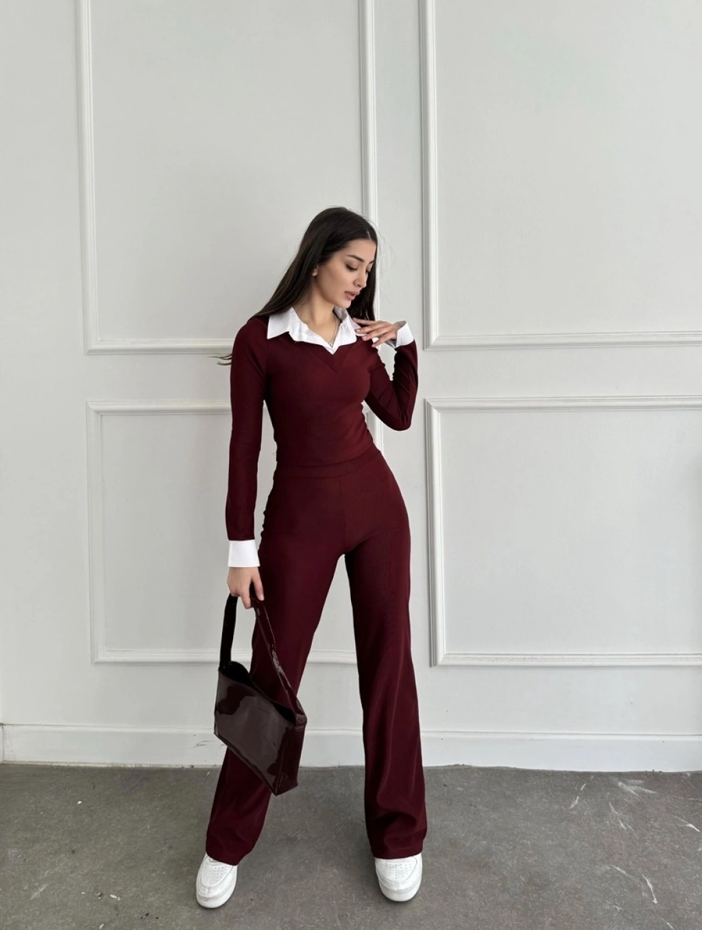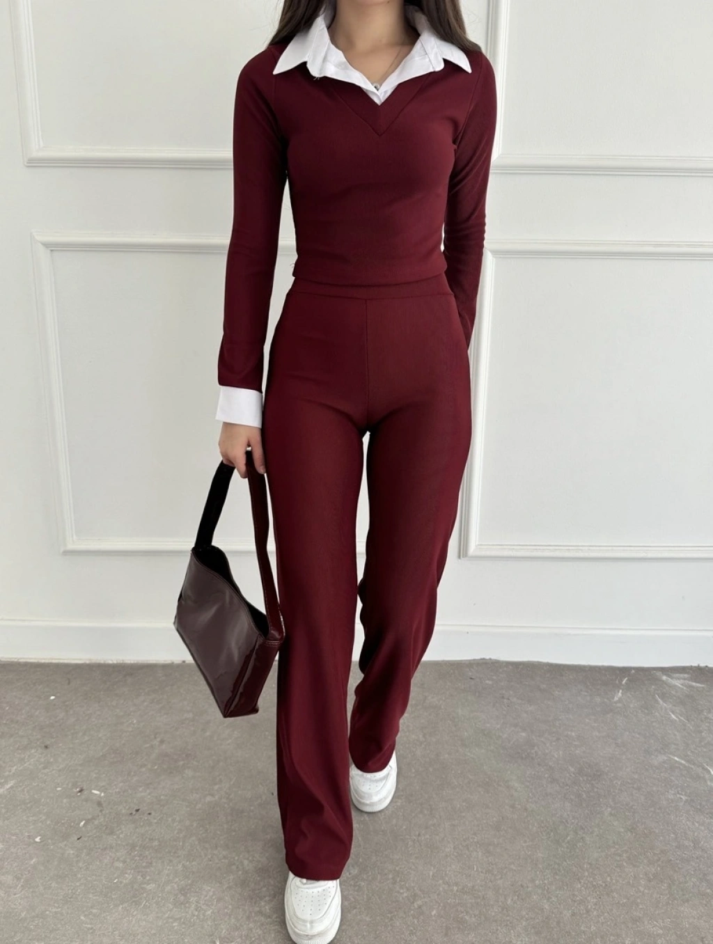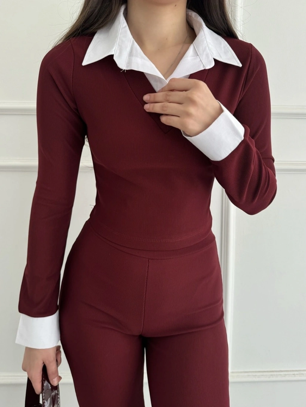 Uzun kol gömlek yaka crop ve pantolonlu ikili takım