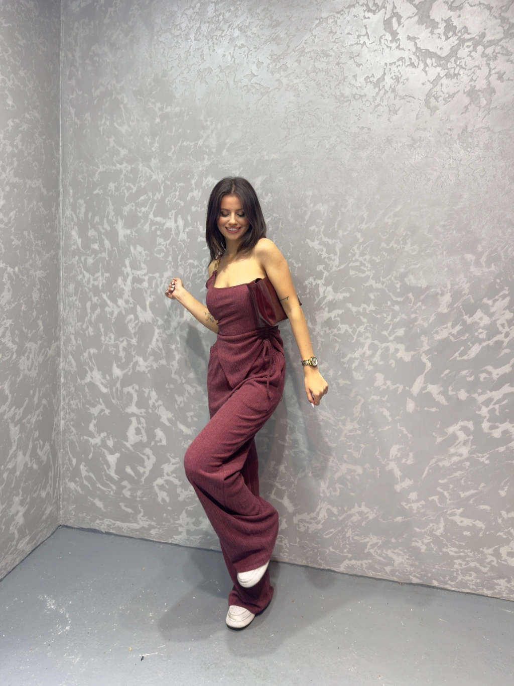 Straplez bluz ve pantolonlu gofre takım