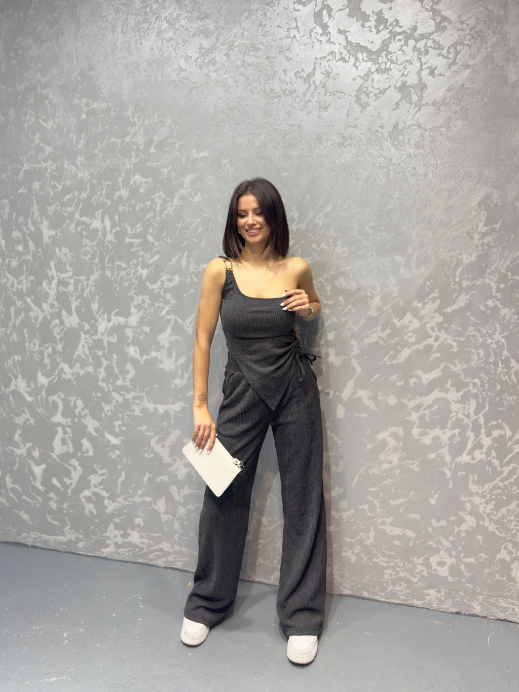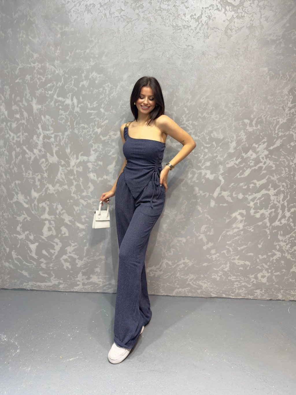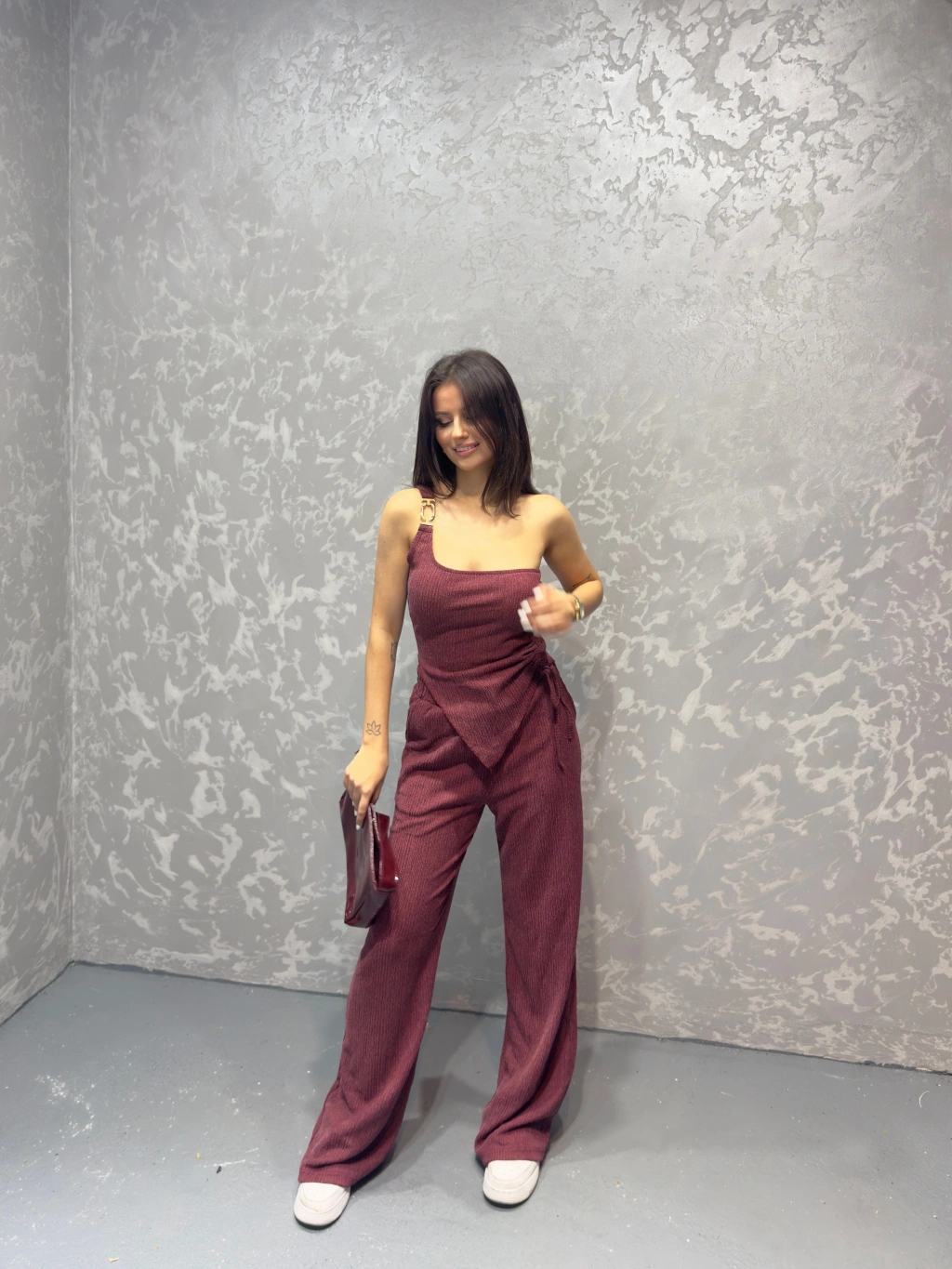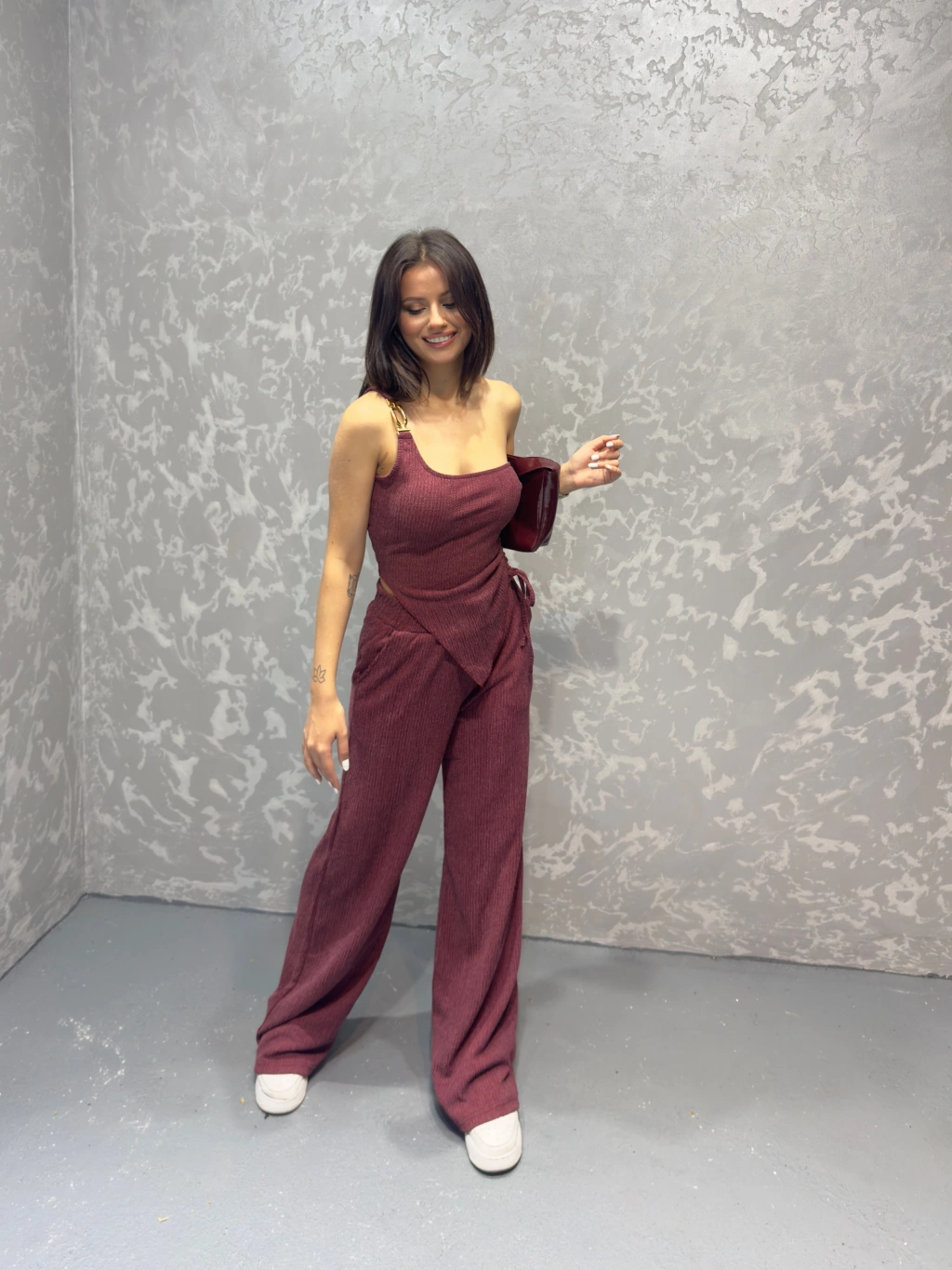 Gofre tek omuz bluz ve pantolonlu ikili takım 3 renk seçeneği